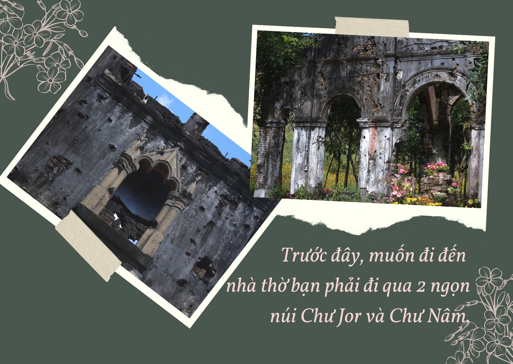 Đứng trước nhà thờ chúng ta có thể dễ dàng thấy một bức tượng Chúa Giê-su trên cây thập giá được treo ở trên khung cửa. Hình ảnh Ngài nằm giữa một phế tích cũ kỹ đã làm bao người Công giáo không khỏi xúc động khi đến đây lần đầu. Đứng từ khuôn viên nhà thờ, chúng ta còn có thể nhìn thấy núi Chư Đăng Ya hùng vĩ, theo tiếng địa phương Chư Đăng Ya có nghĩa là “Củ gừng dại”.