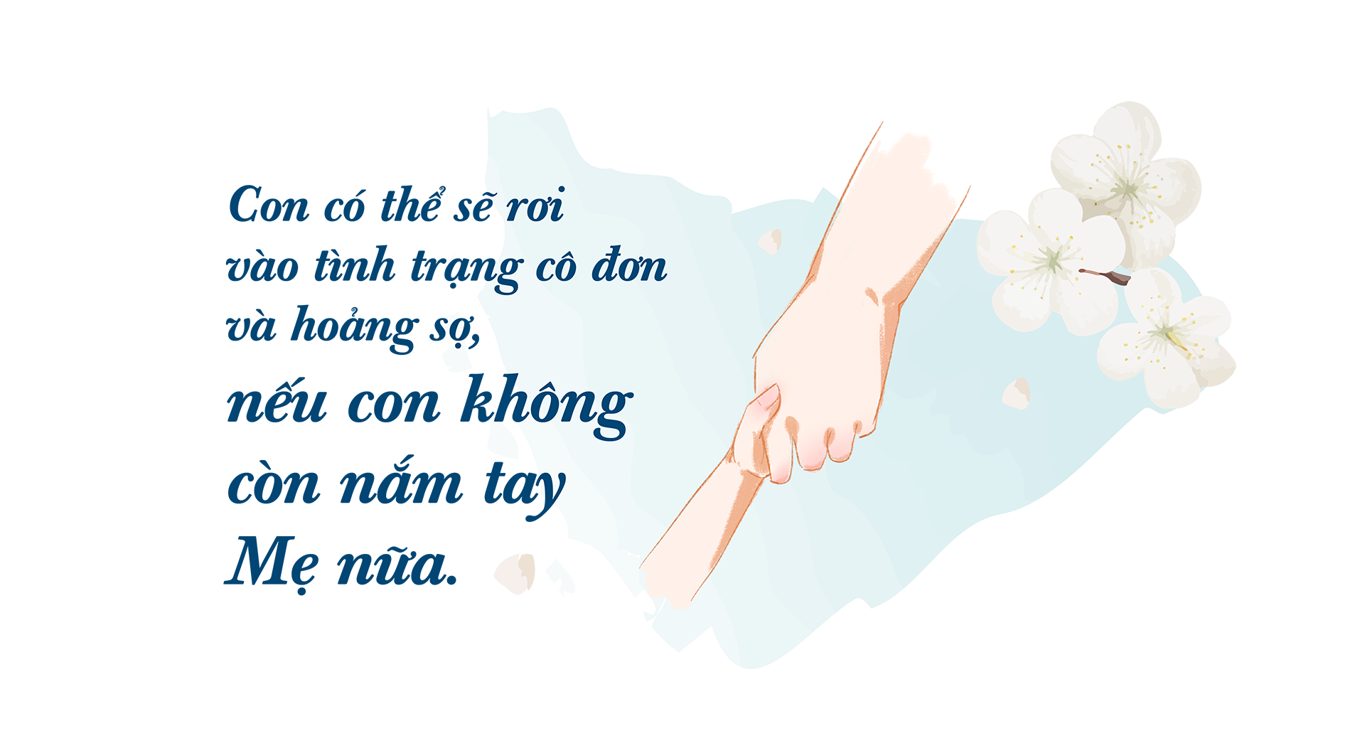 Mẹ ơi! Hôm qua, con chứng kiến một hình ảnh xúc động khiến con nghĩ tới tương quan giữa Mẹ và con. Một em bé kháu khỉnh nắm tay mẹ, cậu đi giữa đám đông mà chẳng lo lắng gì. Trên tay cậu là chiếc kẹo mút, và cứ thế, hai mẹ con ung dung, vui vẻ và đầm ấm đi bên nhau. Cũng thế, con tin Mẹ đang nắm tay con, dìu dắt con trên đường đời. Cậu bé chắc hẳn sẽ hoảng sợ, khóc lóc nếu để tuột mất tay mẹ cậu. Con có thể sẽ rơi vào tình trạng cô đơn và hoảng sợ, nếu con không còn nắm tay Mẹ nữa.