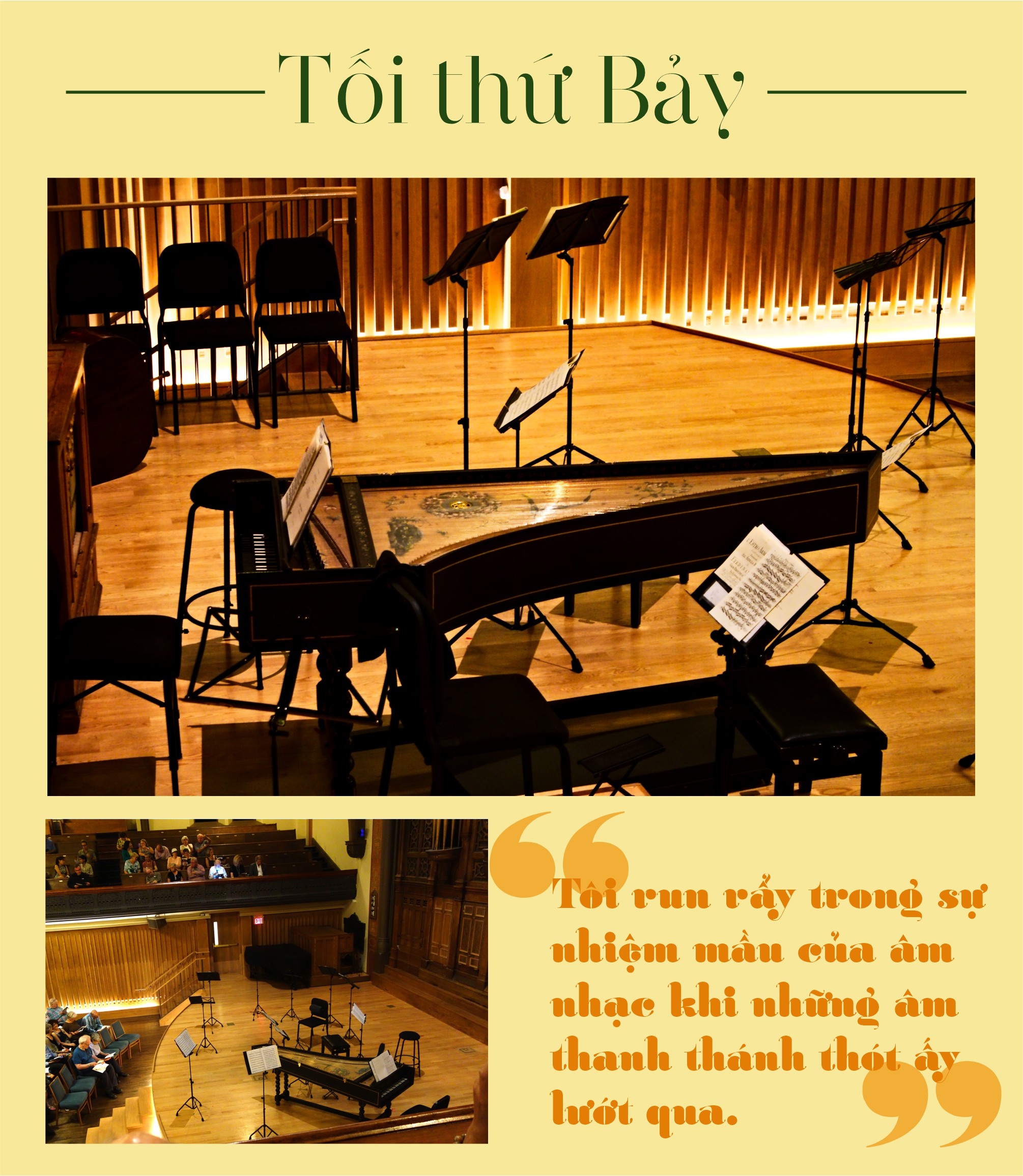 Dàn nhạc ngồi trải khoảng cách trên sân khấu. Những người chơi nhạc cụ đều đeo khẩu trang, người chơi đàn harpsichord đeo găng tay, người chơi kèn oboe ngồi trong khung kính được đặt trên tấm thảm dùng một lần. Dàn hợp xướng thì tạm thời “nghỉ phép”. Nội dung chương trình, tôi xem trên chiếc điện thoại của mình, có ghi rằng, tôi sẽ được nghe tác phẩm từ Venice thế kỷ thứ XVII, tác phẩm được sáng tác trong tâm tình tạ ơn sau thời gian dài thoát khỏi tai ương, dịch bệnh. Kèn oboe phát ra nốt đầu tiên cho sự khởi đầu, các nhạc cụ khác dần hoà theo. Tôi run rẩy trong sự nhiệm mầu của âm nhạc khi những âm thanh thánh thót ấy lướt qua. Đã gần một năm, tôi không đi xem buổi hoà nhạc nào ngoại trừ nghe cô con gái nhà hàng xóm luyện tập kèn clarinet. Trực tiếp nghe những tác phẩm này, tôi mới nhận ra rằng những bản được ghi âm trong studio thật nhàm chán.