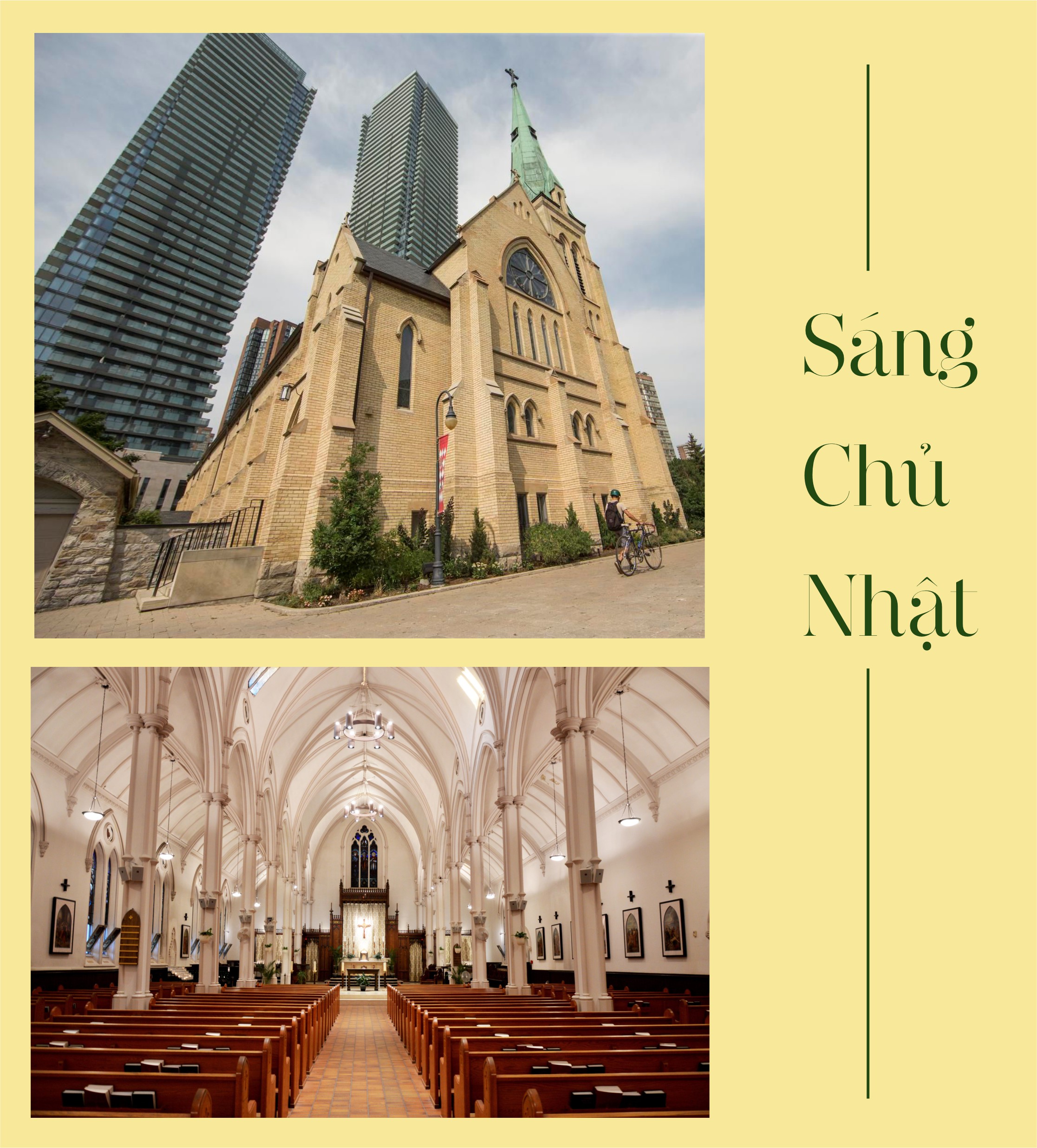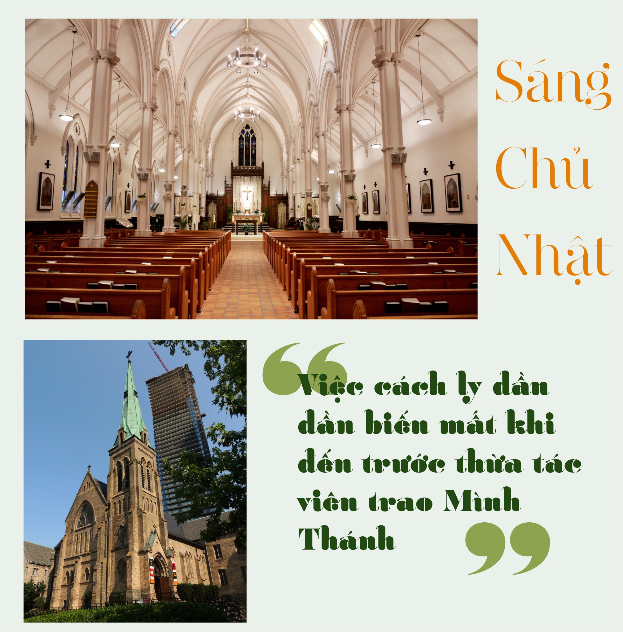 Tại nhà thờ Thánh Cả Basil (nằm trong Đại học Toronto), tôi đứng vào hàng cùng với những người đã có vé để tham dự thánh lễ lúc 11:07 sáng, đi theo chỉ dẫn: “Đi qua cửa hướng tây và đứng trên những điểm có dấu đỏ”. Có người kiểm tra khẩu trang và đo thân nhiệt của tôi. Khi thánh lễ 10:30 đã kết thúc, tôi trật tự bước lên những bậc thang tiến vào thánh đường. Các thành viên trong gia đình được ngồi chung với nhau, một số người đơn lẻ thì ngồi cách xa, rải rác trong nhà thờ. Tôi chọn cho mình chỗ mà camera có thể bắt được hình mình cho Thánh lễ trực tuyến trên YouTube. Mẹ tôi sẽ tham dự thánh lễ trực tuyến và chắc chắn rằng tôi cũng đang tham dự thánh lễ. Tôi chào hỏi những anh chị em mà tôi đã từng gặp gỡ trên những buổi chia sẻ Kinh thánh trực tuyến. Tuy rằng tôi cũng cúi đầu nhẹ nhàng chào hỏi, nhưng những cuộc giao lưu chính hiệu này đều ở trên những trang mạng xã hội. Ban phụng vụ đeo găng tay, chuẩn bị vật dụng cần thiết cho việc cử hành thánh lễ. Trong thánh lễ sẽ không có người giúp lễ.