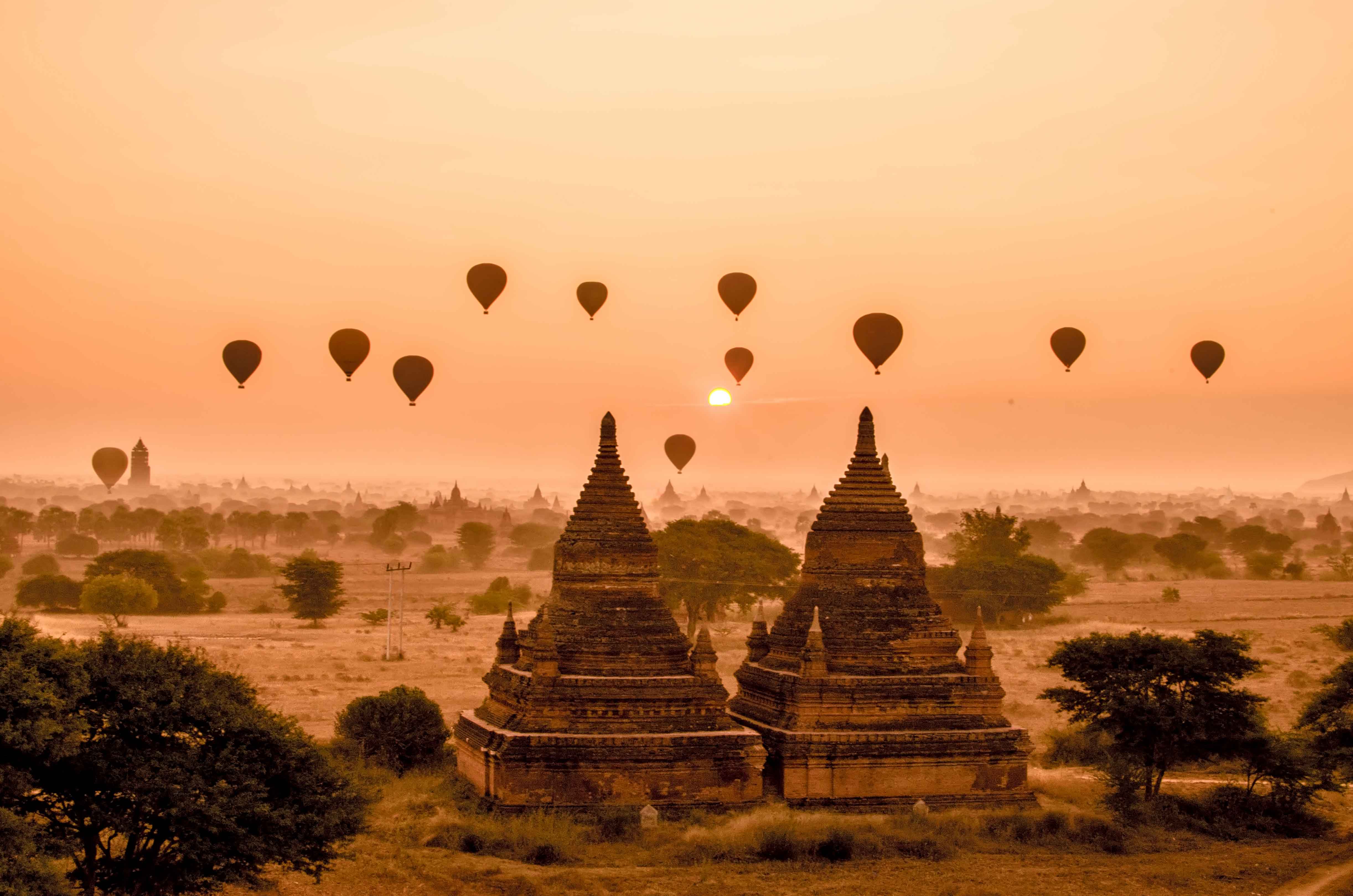 Bagan nổi tiếng với đền tháp và khinh khí cầu. Mặt trời ở Bagan đẹp như được vẽ từ trong tranh khi đậu trên đỉnh những toà tháp cổ kính và màn sương mờ ảo. Đoàn chúng tôi đến Bagan lúc 2 giờ sáng, sau một ngày dài vật vã trên xe, với đủ thứ trò được bày ra để giết thời gian. Sau khi nhận phòng, ai nấy nằm lăn ra ngủ, nên không được ngắm bình minh. Ai cũng có ước mơ được một lần ngồi trên khinh khí cầu ngắm toàn bộ khu di tích đền đài ở Bagan, nhưng không ai đủ giàu để có thể tiêu xài hoang phí, nên kế hoạch cũng bất thành.