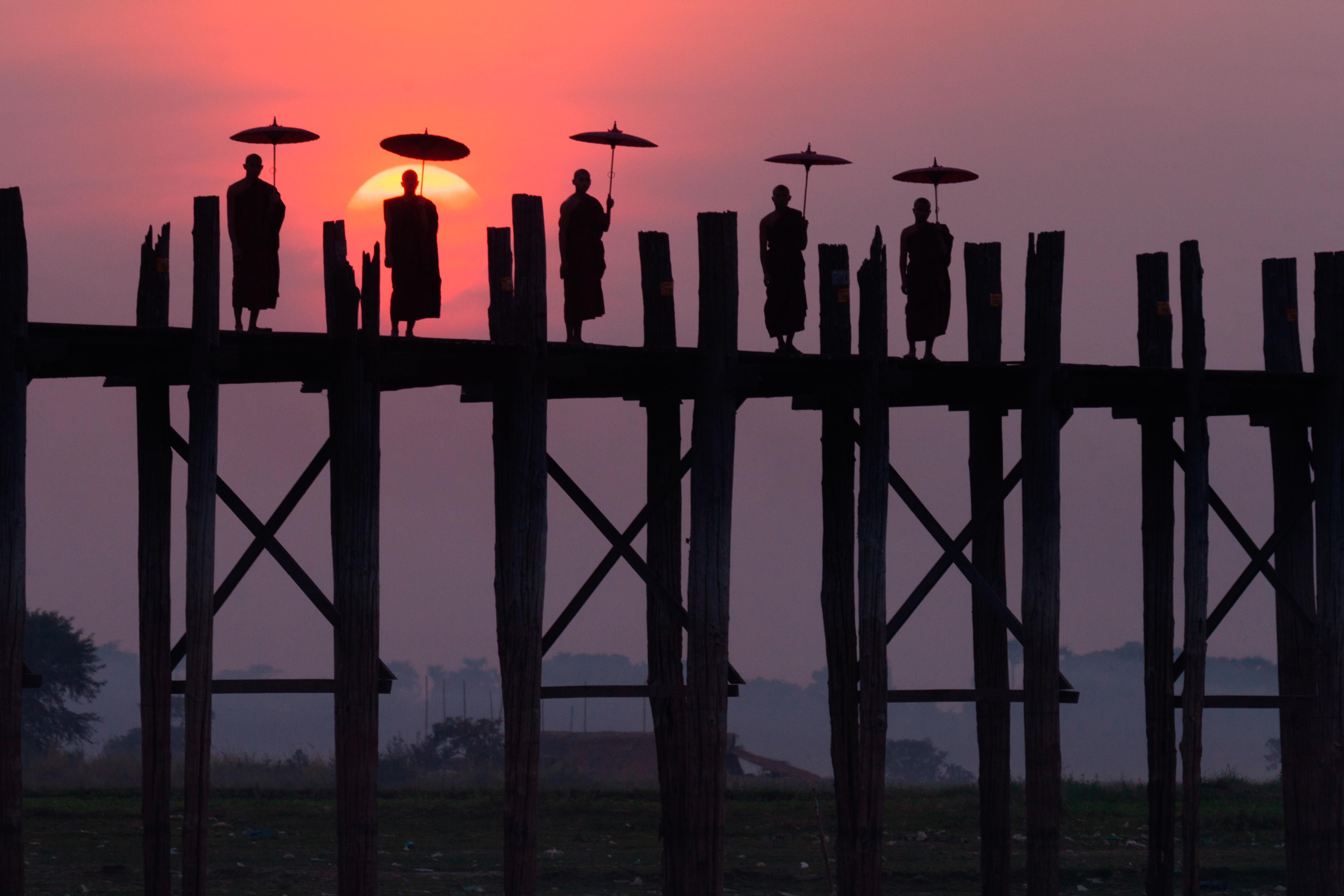 Chiều xuống, cả đoàn lại vội vã đến cầu U Bien để ngắm hoàng hôn. Tuy du khách khá đông, đi lại tấp nập, chen nhau những chỗ đứng ưng ý nhất trên cầu. Nhưng đúng lúc khoảnh khắc mặt trời từ từ khuất bóng, tất cả dường như dừng lại, lặng im và nhìn ngắm. Mặt trời lặn rất nhanh, chừng chưa đầy 2 phút. Sau đó người đi lại tiếp tục vội vã. Tôi một mình lặng lẽ đi về phía chân cầu, hơi thất vọng vì cây cầu trong huyền thoại lại trở nên xô bồ như thế. Vô tình tôi phát hiện có một lối đi bộ xuống phía dưới sông, khu đất nhô lên vì đang mùa nước cạn. Phía dưới có khá nhiều xe khách đang đậu, nên tôi cũng lững thững đi xuống, ngắm cầu U Bien từ phía này xem sao. Bỗng bầu trời chuyển sang cam cả một vùng rộng lớn. Từ phía dưới, nhìn xuyên qua cây cầu, khung cảnh dường như khác hẳn, như trong một bức tranh chỉ 2 sắc đen và cam, với những chuyển động chậm rãi, lặng lẽ. Mandalay trở nên quá đỗi yên bình…